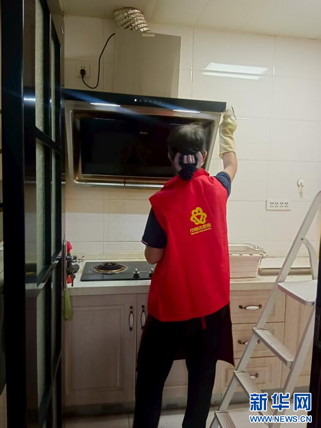 圖為蘭州市七里河區(qū)柳家營社區(qū)巾幗家政服務(wù)驛站工作人員上門進行廚房保潔服務(wù)。(甘肅省婦聯(lián)供圖)