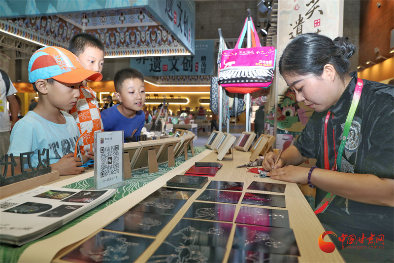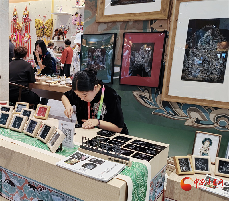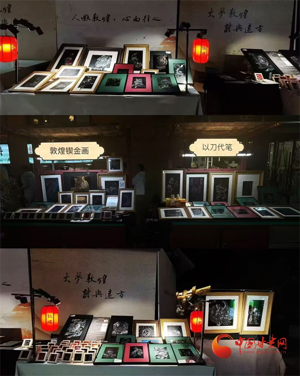 第八屆敦煌文博會(huì)非遺文創(chuàng)展區(qū),非遺藝人王婕正在展示鍥金畫技藝。通俗來說就是在金屬板上刻畫,每一個(gè)線條都要用刻刀在金屬板材上留下印痕。