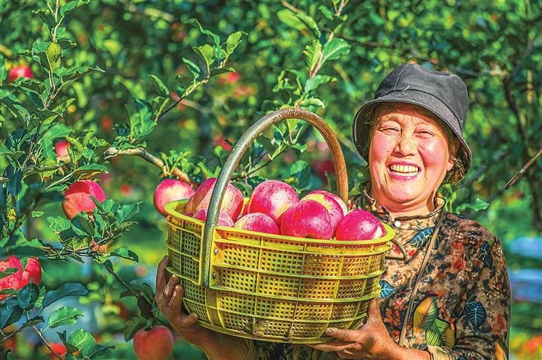 秋日平?jīng)觯旄咴频?。百萬畝果園里,紅果壓枝,甜香四溢。