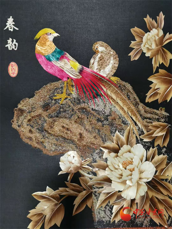 多年打磨后,郭百花走出了獨(dú)特的創(chuàng)作之路——以拼貼手法為主,讓作品更具層次感與立體感。在她十幾平米的“百花麥稈藝術(shù)工作室”里,《春韻》勾勒出江南詩意,《敦煌文旅》再現(xiàn)絲路風(fēng)情,《孔雀戲牡丹》盡顯雍容華貴,而《錦上添花》中,小鳥的羽毛竟由細(xì)如發(fā)絲的麥稈剪貼而成,市場價達(dá)1500元左右。這些作品里,既有山川花鳥的靈動,更藏著通渭的鄉(xiāng)土記憶,平凡麥稈在她手中徹底“化腐朽為神奇”。