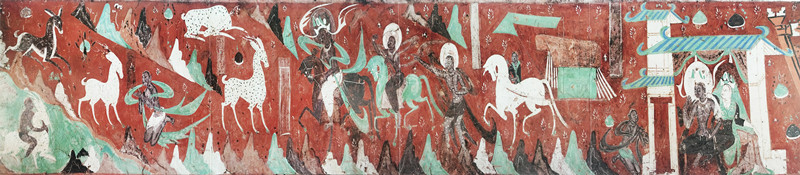 這幅壁畫在藝術(shù)風(fēng)格上獨(dú)樹一幟,深受中原繪畫形式的影響。它既摒棄了印度壁畫的環(huán)形構(gòu)圖方式,又不同于龜茲壁畫里的菱形畫面布局,而是開創(chuàng)性地采用了連環(huán)畫式的長(zhǎng)卷式構(gòu)圖,宛如一條歷史的長(zhǎng)河,將故事娓娓道來(lái)。
