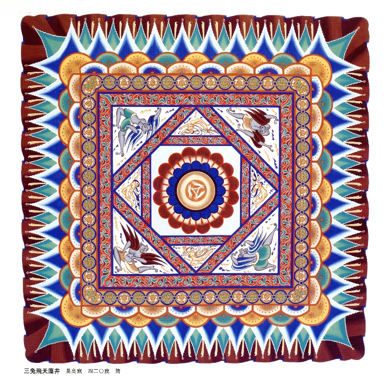 三兔共耳圖案、成熟的飛天造型、精美的紋飾圖案相互映襯,共同構(gòu)成了這幅令人嘆為觀止的藻井壁畫(huà),受到人們的廣泛關(guān)注和喜愛(ài)。
