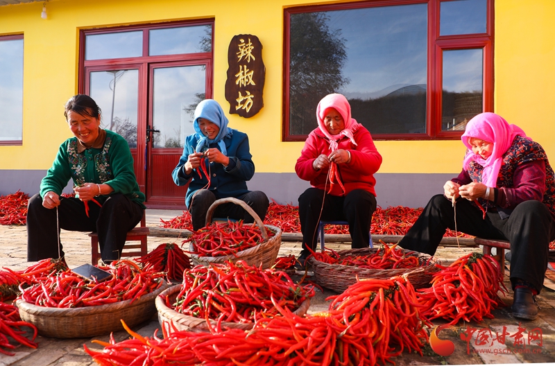 “辣嬸子”陳歲香和村民一起串辣子。喬潔攝